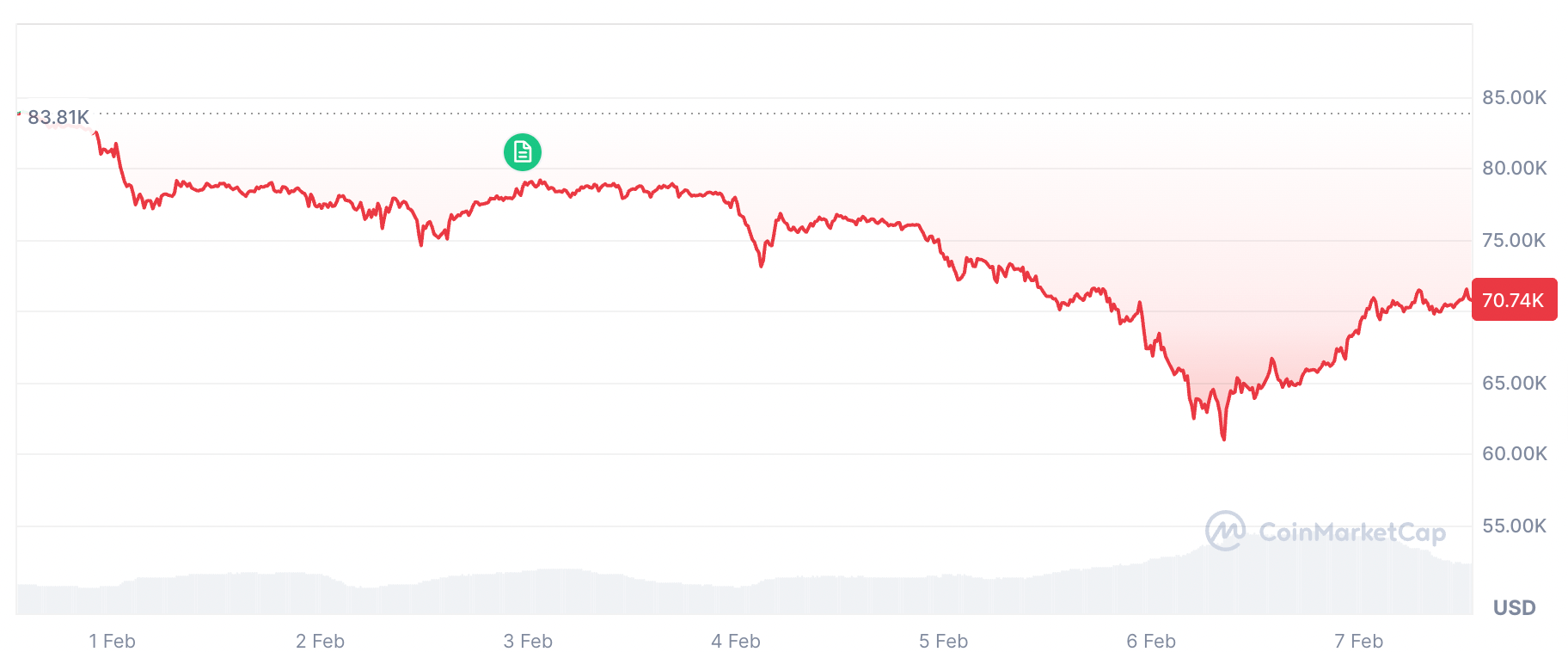 O aumento ocorre à medida que o Bitcoin caiu de cerca de $81.500 em 1º de fevereiro para aproximadamente $60.000 em cinco dias, antes de se recuperar para $70.740 no momento da publicação, de acordo com o CoinMarketCap.