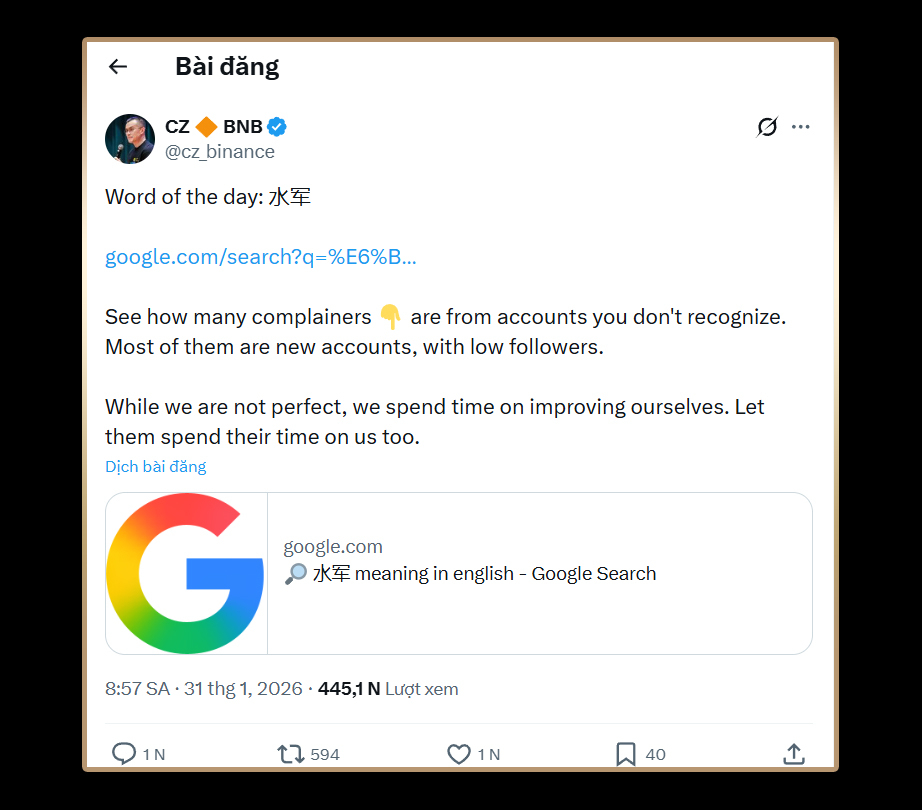 🔸Về các tài khoản giả mạo: CZ giải thích từ "水军" (shuǐ jūn - quân Internet) và chỉ ra: "Hầu hết những người phàn nàn là từ các tài khoản bạn không nhận ra. Phần lớn là tài khoản mới, với ít người theo dõi"