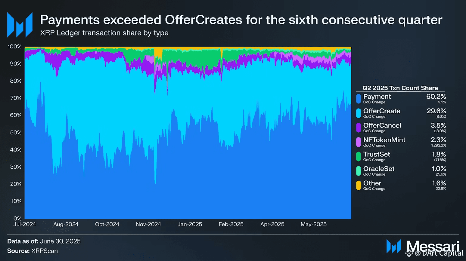 Grafik ini dengan jelas menunjukkan adanya pergeseran dramatis dalam jenis transaksi yang paling sering digunakan di XRP Ledger. Dulu, platform ini sering dianggap sebagai tempat 'bermain' para trader dengan aktivitas seperti OfferCreate. Namun, tren itu kini berubah total. 🔄