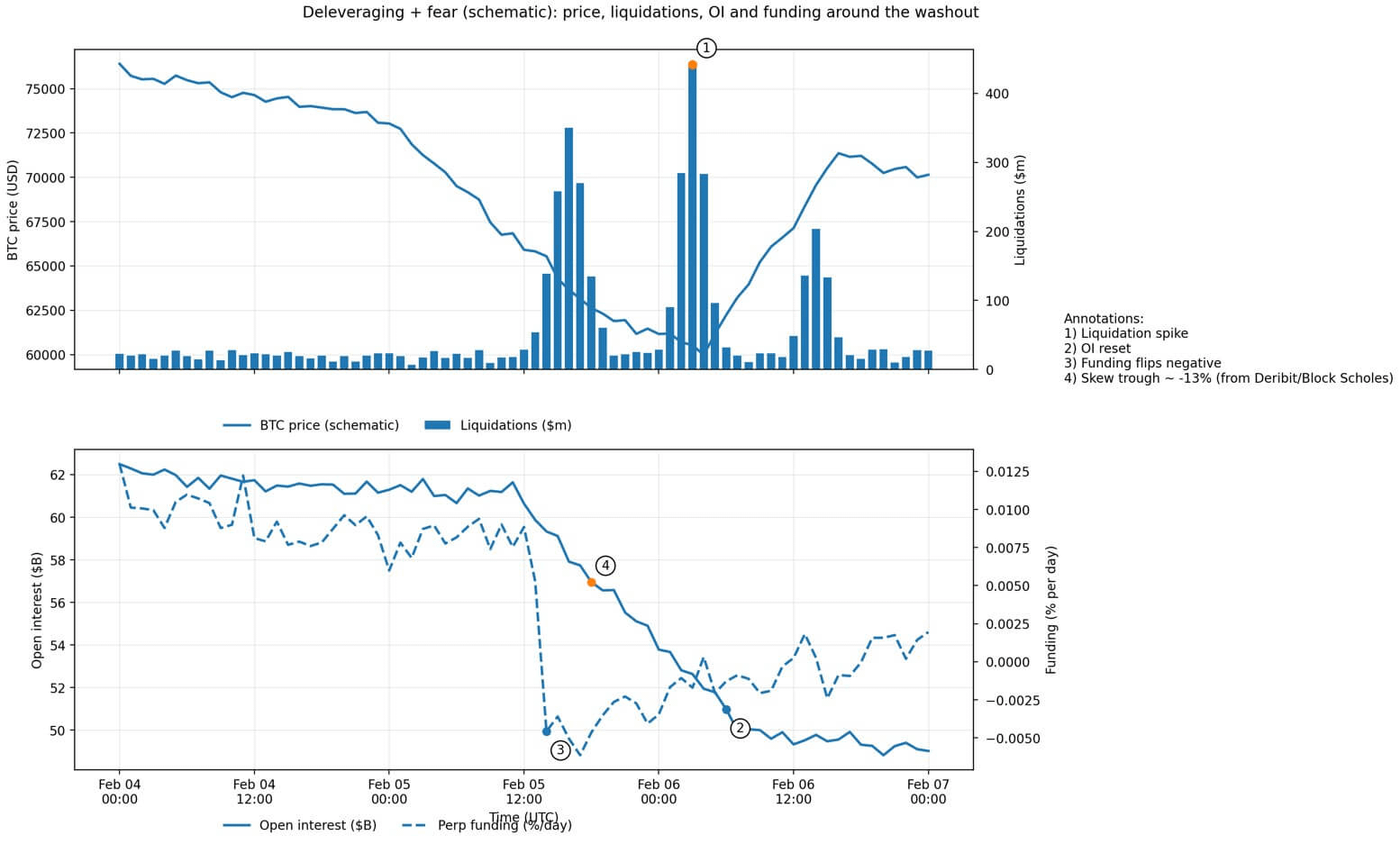 A pesquisa do analista confirmou a contaminação, observando que o sentimento dos derivativos se voltou extremamente bearish, com taxas de financiamento negativas, estruturas de volatilidade implícita invertidas e uma assimetria de risco-reversão de 25-delta esmagada para aproximadamente -13%.