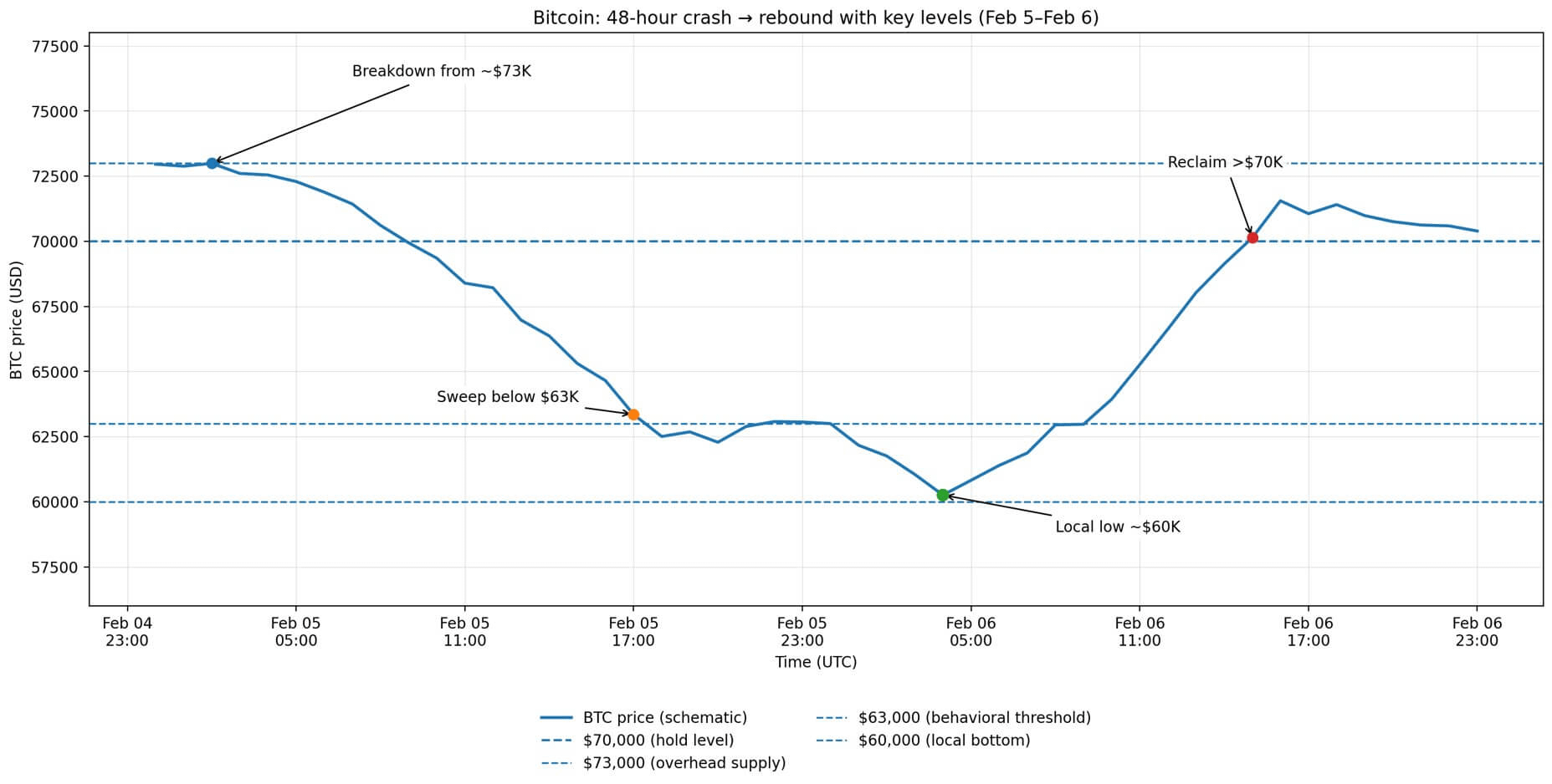 6 de fevereiro abriu onde 5 de fevereiro fechou, caiu para um mínimo intradiário perto de $60.000, então subiu para um máximo em torno de $71.422, que não conseguiu ultrapassar três vezes antes de cair de volta abaixo de $70.000.