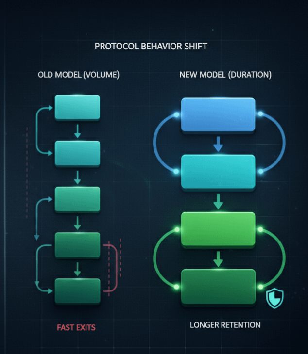 A recent on-chain signal helps explain that shift. Over the past few weeks, average liquidity retention lengthened while short‑window withdrawals declined, even as total inflows stayed flat. At the same time, a protocol update adjusted reward weighting toward duration rather than raw volume, changing who benefits from staying put. This alters how depth absorbs stress and how quickly exits occur. If liquidity is choosing to wait instead of rotate, what does that say about confidence in the underlying mechanics?