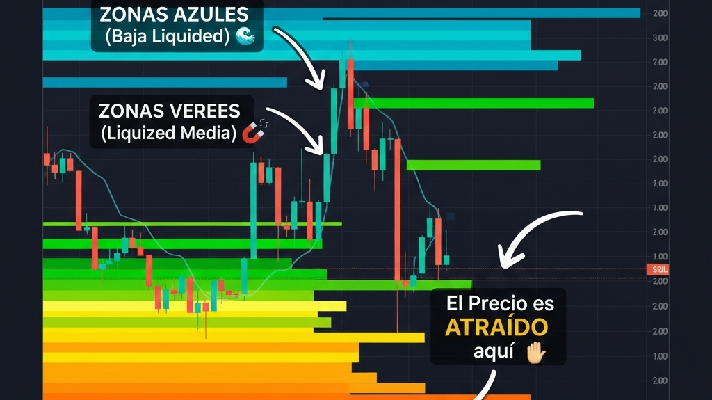 Zonas de Alta Liquidez (Amarelas e Laranjas): Estas são as zonas cruciais! Aqui se acumula uma quantidade massiva de capital de traders com alto apalancamento. O preço se sente fortemente atraído para essas zonas.