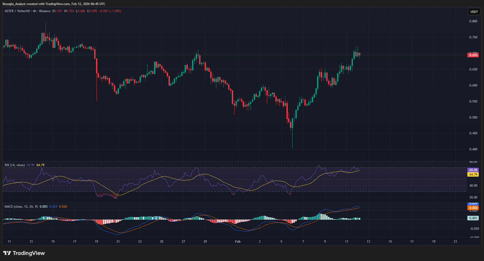 $ASTER formou um baixo perto de 0,4$ em 6 de fevereiro, sexta-feira, e agora está se recuperando. No momento em que escrevo, a Aster está sendo negociada perto de 0,7$, formando múltiplas velas verdes, criando uma tendência de alta. Tem sido quase 80% acima do baixo recentemente formado. Os indicadores de negociação também estão mostrando impulso de alta na Aster.
