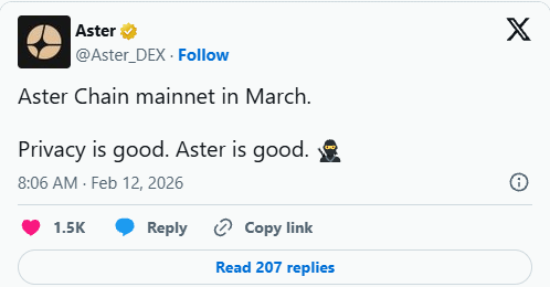 Aster, uma exchange perpétua descentralizada endossada pelo fundador da Binance, Changpeng Zhao, planeja lançar a mainnet da Aster Chain em março, anunciou a equipe no X na quarta-feira.