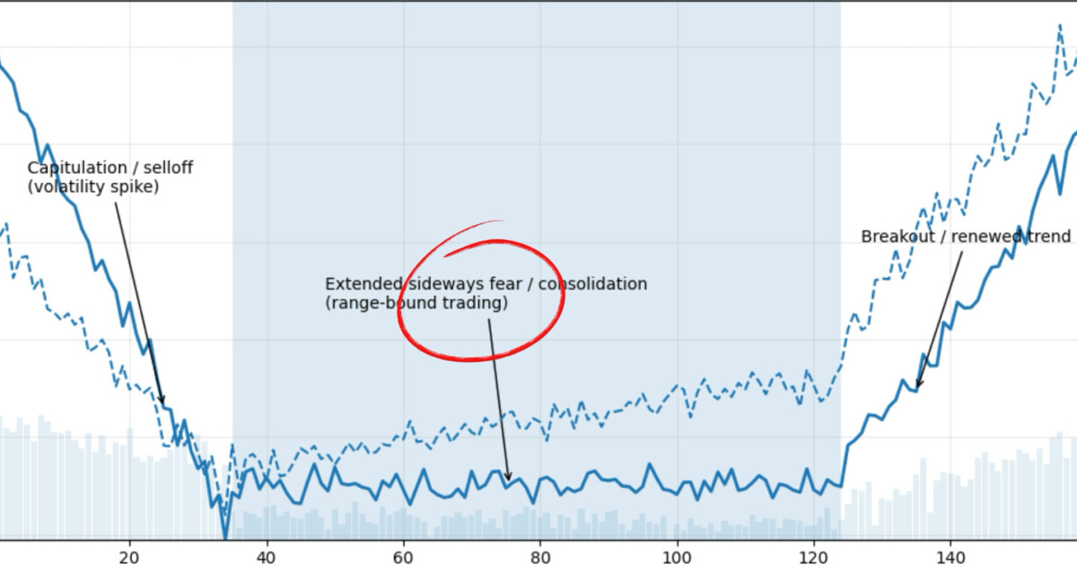 Isso é frequentemente referido como o período de consolidação para um ativo e normalmente acontece entre extremos. A fase de medo lateral estendida gradualmente esgota a psicologia dos investidores. É marcada por um mercado limitado, participação reduzida, baixa confiança e ceticismo persistente que persiste por semanas ou até meses.