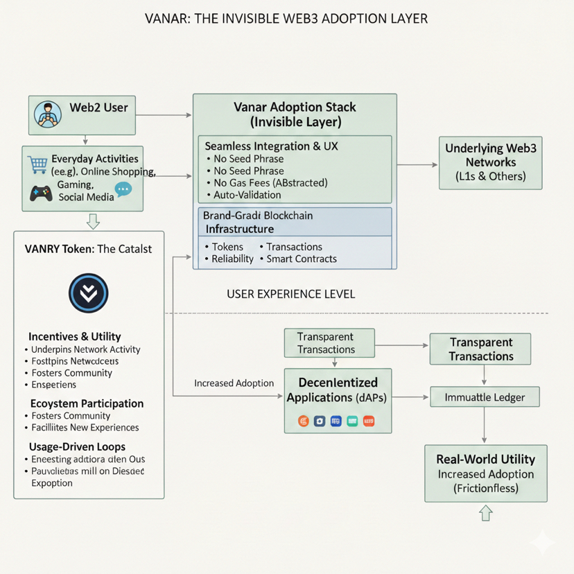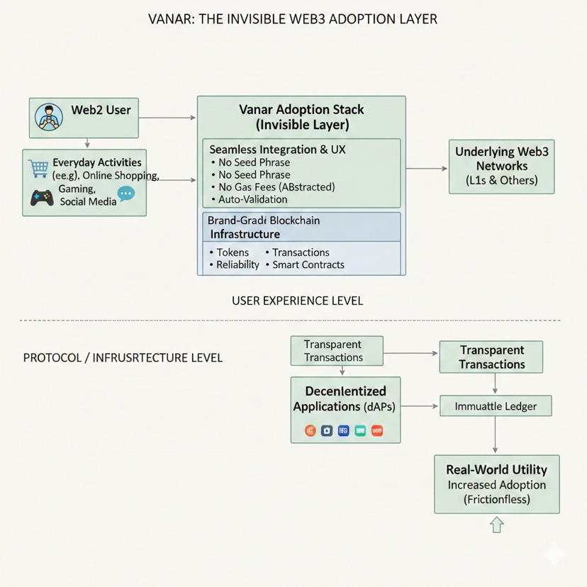 A Vanar está estrategicamente posicionada para priorizar essa expectativa como o alvo de design, em vez de considerá-la uma reflexão tardia. O conceito de uma pilha de adoção de marca se alinha perfeitamente com este projeto. A Vanar busca criar uma experiência do usuário que se integre perfeitamente às atividades do dia a dia, garantindo que os usuários do Web2 se envolvam com cripto sem nem perceber. Ao considerar a Vanar no contexto da adoção genuína, ela transcende ser meramente “mais uma L1 com recursos”. Funciona como uma camada invisível dentro do Web3, semelhante à infraestrutura de consumo contemporânea.