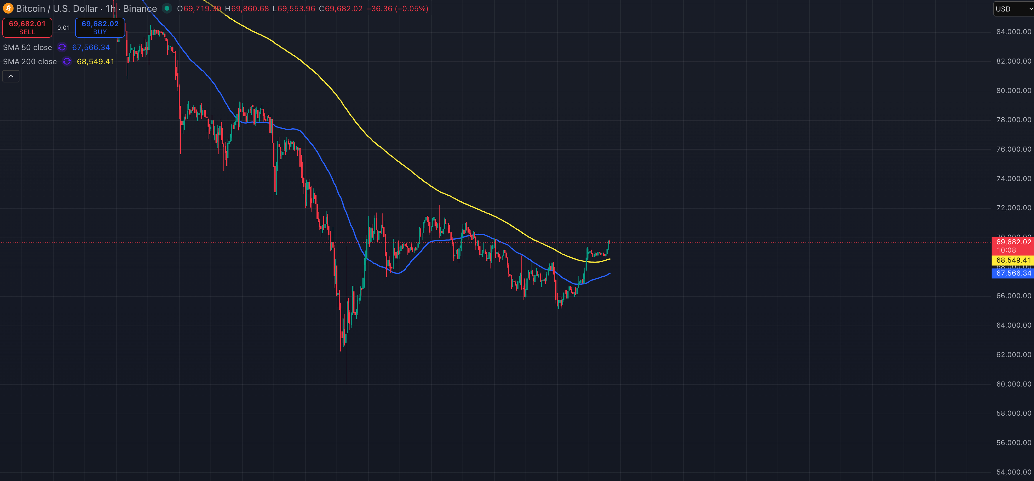 Dados do TradingView mostraram ganhos diários de até 4% no preço do BTC no momento da redação, com BTC/USD alcançando $69,682 na Binance.