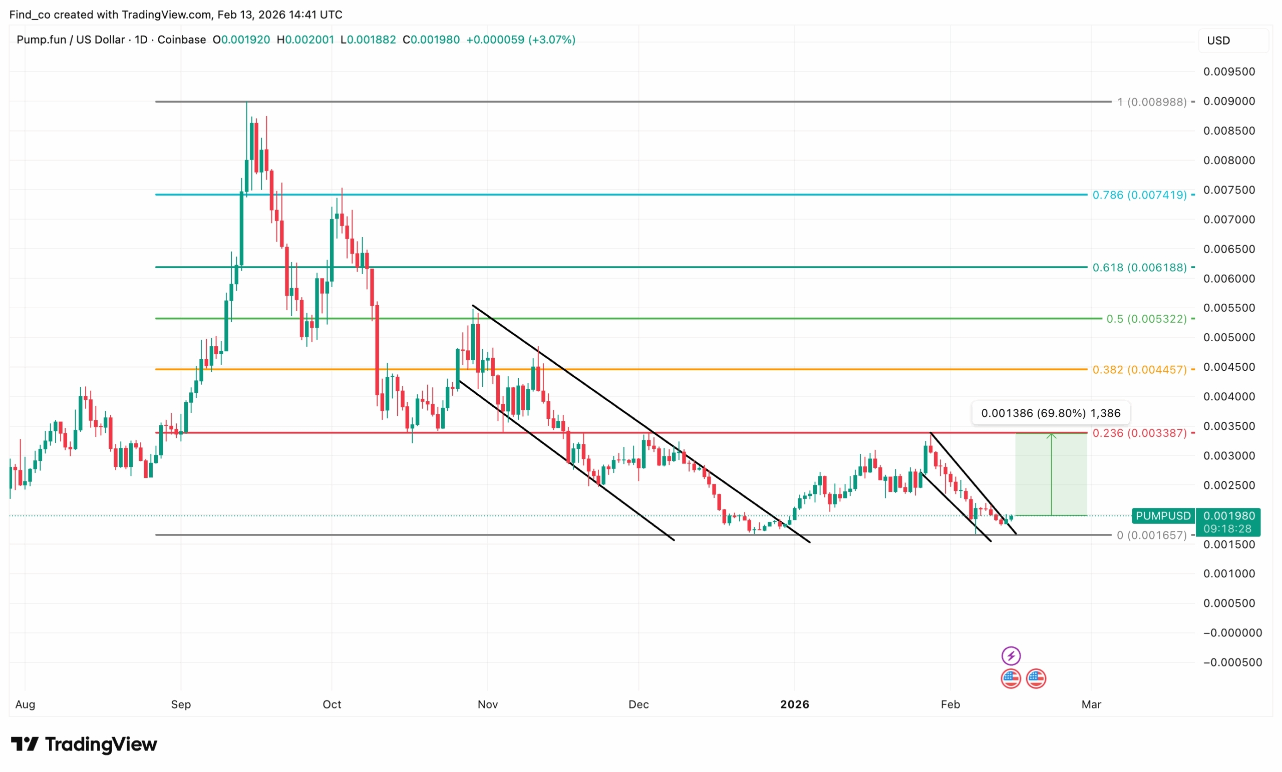 PUMP não é otimista. Está comprimido. Essa distinção importa. O preço está preso em uma tendência de queda macro desde o blow-off perto de 0.009, mas o caráter do movimento mudou. Agora estamos avançando em direção ao suporte horizontal principal em torno de 0.0017, e a volatilidade colapsou.