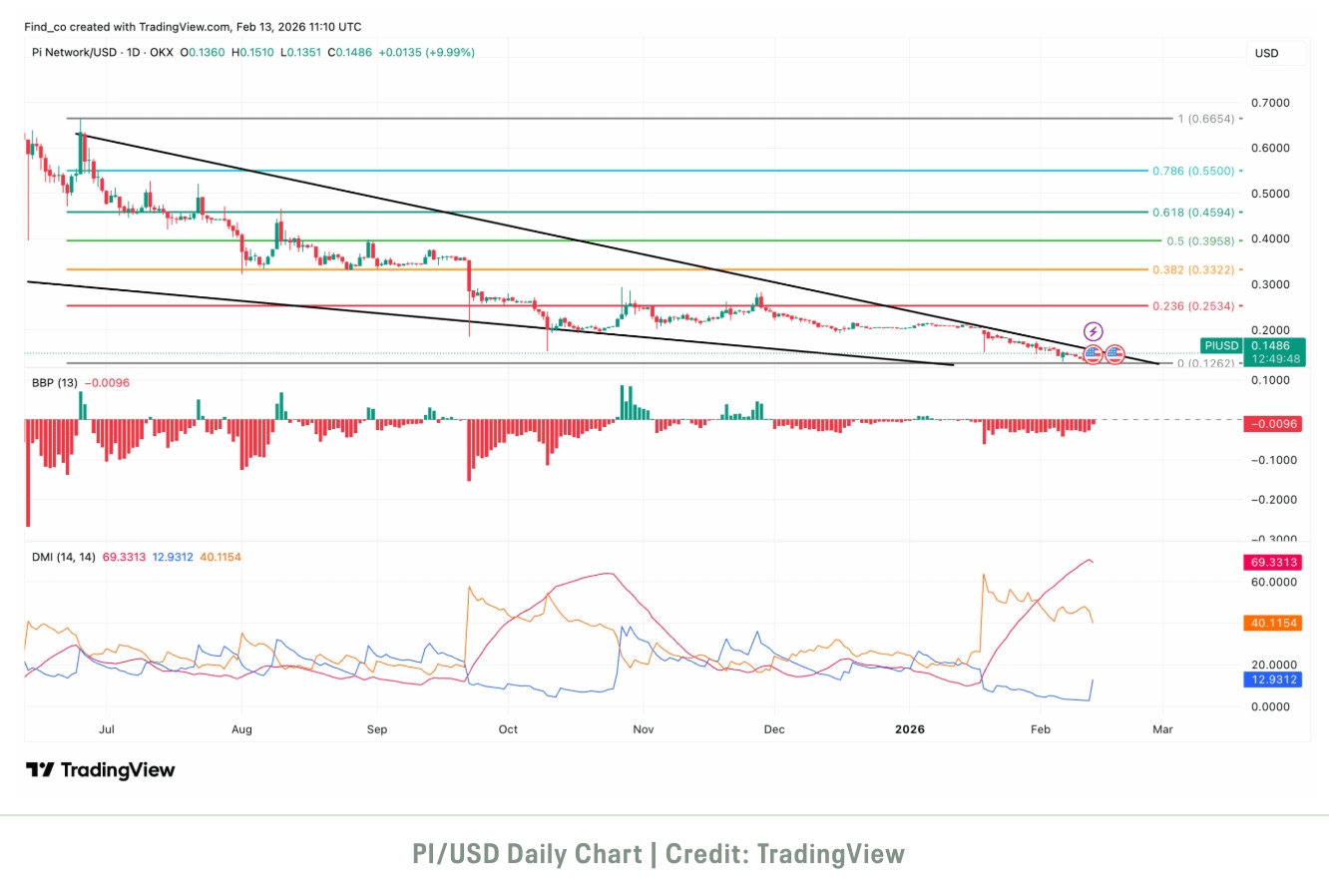 Dar um passo atrás torna a imagem mais clara. O PI ainda está negociando dentro de um canal descendente, e cada salto continua a estagnar na resistência estrutural. Isso não é impulsionado por notícias ou sentimentos. É simplesmente a tendência se comportando como as tendências costumam fazer.