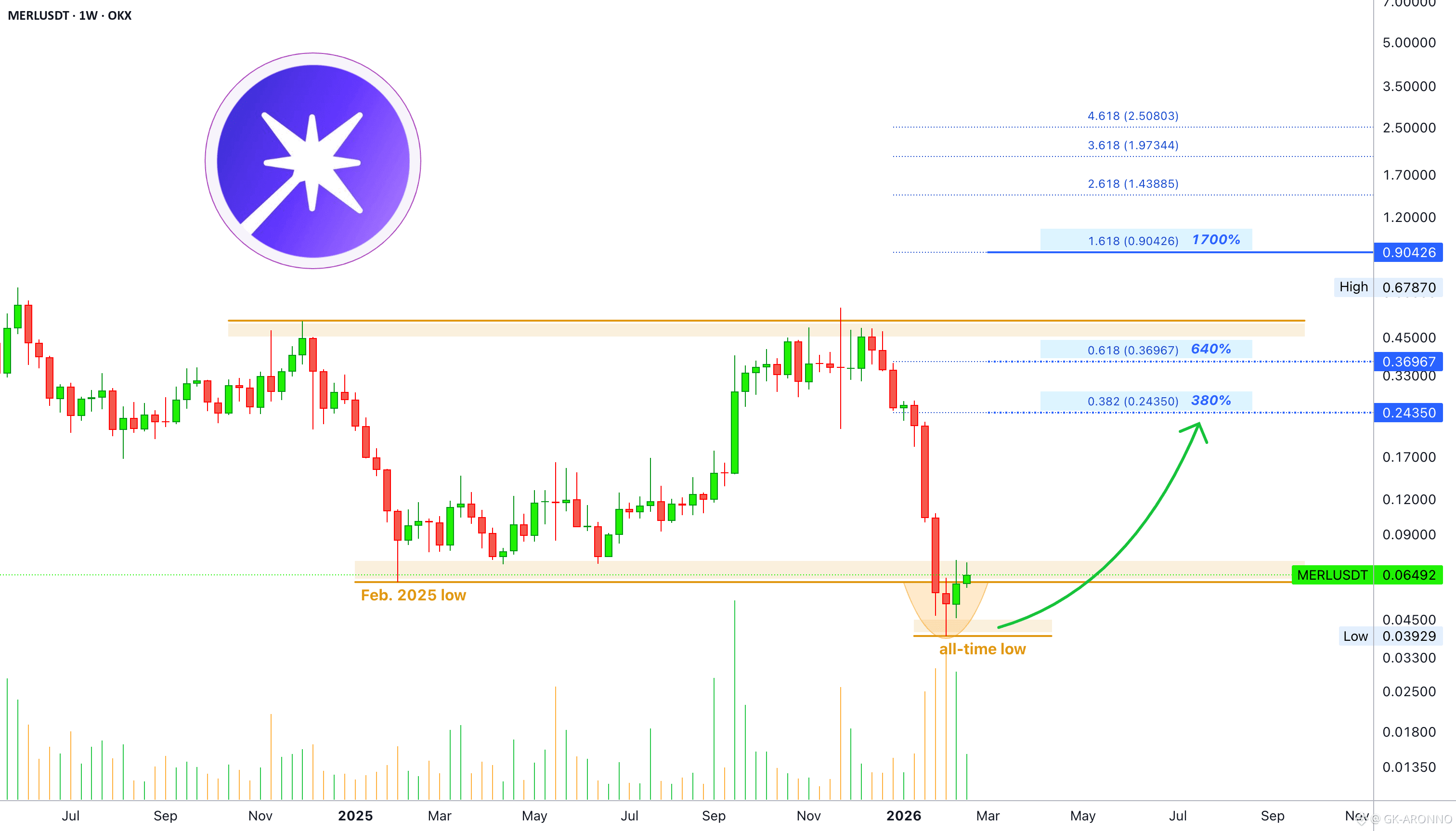 MERLUSDT is moving back above long-term support, the low from February 2025. Revealing the last move as a stop-loss hunt event.