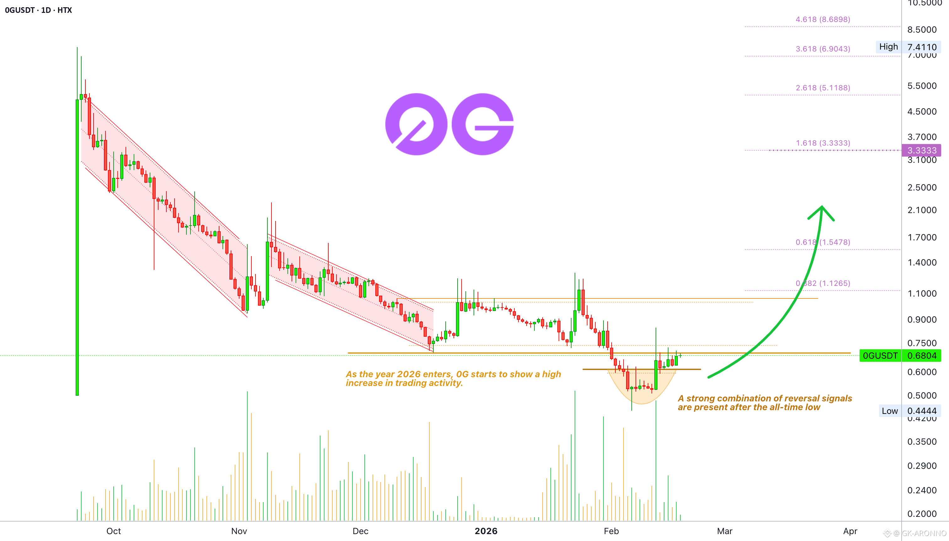 OGUSDT ended its downtrend around mid-December 2025. There was a lower low in February but this isn't part of the initial downtrend, more like a stop-loss hunt event.