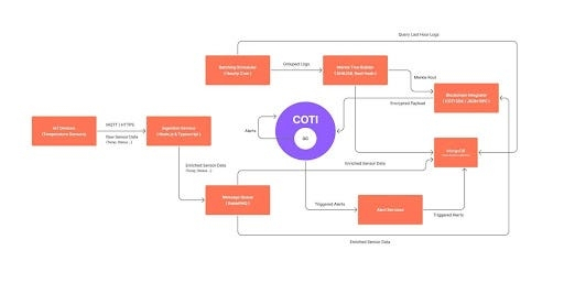 A arquitetura é elegante em sua simplicidade. Sensores IoT monitoram continuamente a temperatura, umidade e status da bateria em equipamentos de armazenamento de vacinas. Esses dados fluem através da camada de ingestão do VaccineLedger, onde são validados, enriquecidos com metadados do ativo e criptografados usando a estrutura de criptografia da COTI.