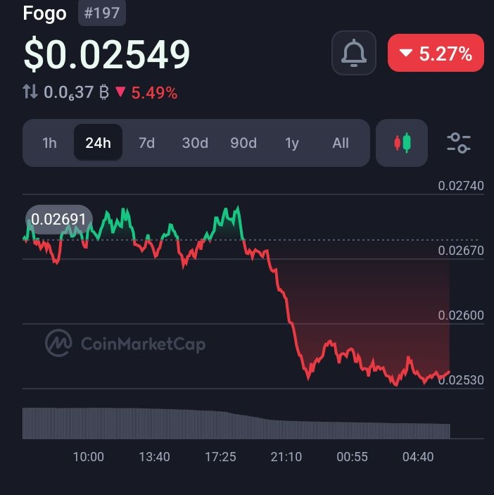 Com base no gráfico de 24h mostrado, @fogo está atualmente negociando em torno de $0.02549 após um notável declínio intradiário de aproximadamente 5%. A ação do preço mostra uma fase de consolidação inicial perto da zona de $0.0267–$0.0269, que atuou como resistência de curto prazo. Depois de falhar em romper e se manter acima de $0.0270, $fogo sofreu uma venda acentuada em torno da marca de 21:00, levando a uma queda em direção à região de $0.0253.