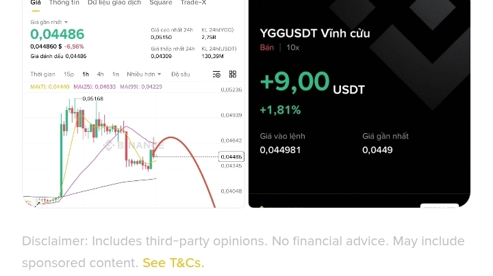 $YGG está lutando contra a resistência, mas a alta parece fraca. Entrada: 0.0440–0.0455, SL 0.05, TP1 0.0415, TP2 0.0388, TP3 0.0360. O impulso diminui a cada empurrão, as altas são absorvidas, e os vendedores defendendo esta zona apontam para uma provável rotação para baixo.
