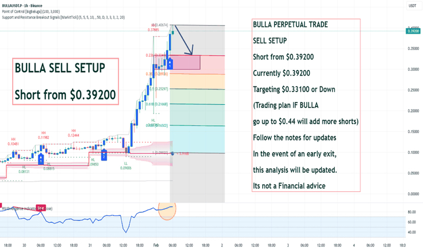 A detailed view with a sell setup annotation, focusing on recent price levels around $0.39.