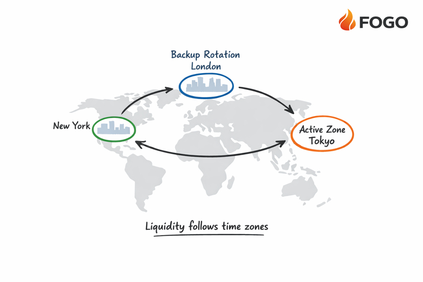 Fogo coloca zonas de validadores ativos perto de centros financeiros como Tóquio e rotaciona a responsabilidade de backup entre Londres e Nova York. Em vez de distância igual para todos, a rede segue a liquidez através de fusos horários. Menos saltos na rede significam confirmações mais rápidas. Os formadores de mercado atualizam cotações mais rapidamente. Os traders reagem a preços ao vivo em vez de preços atrasados.