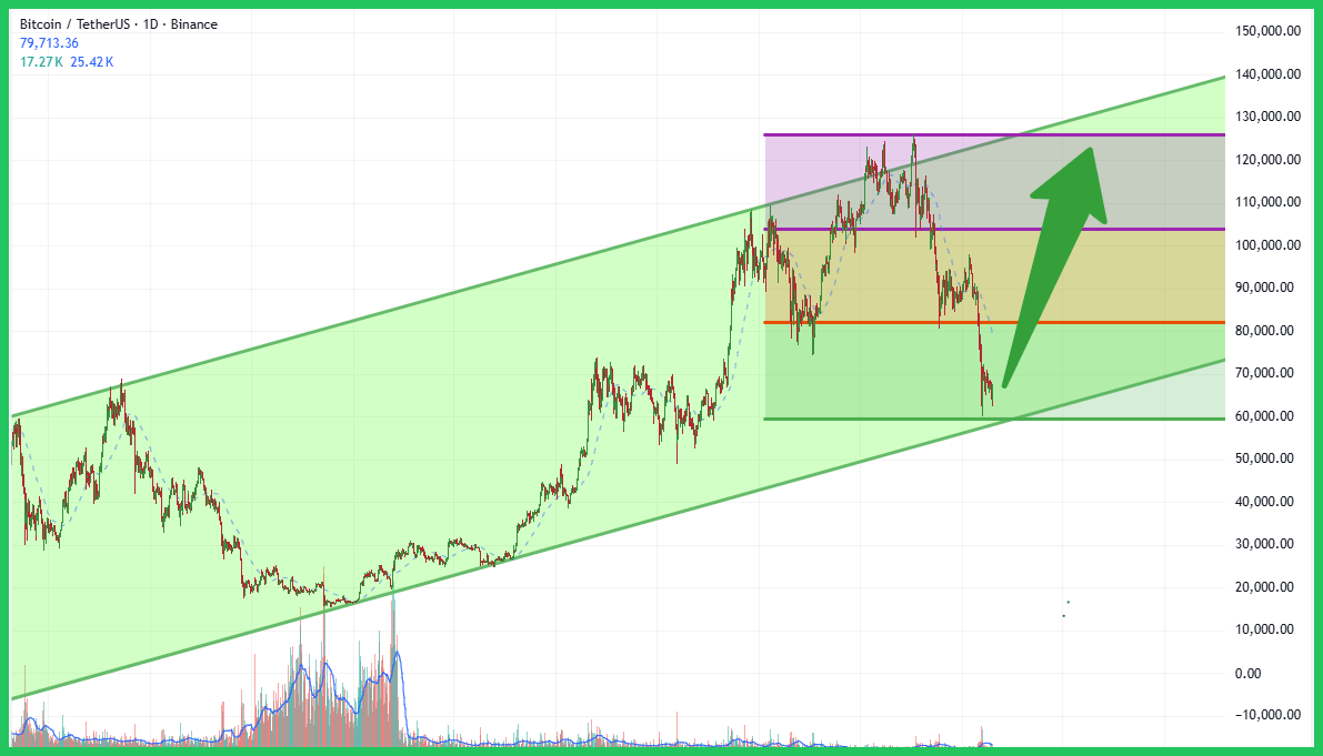 Estamos analisando o gráfico 1D do BTC/USDT, e o que se destaca é o claro canal de alta de longo prazo em que o Bitcoin tem negociado. Após uma corrida significativa, o preço se retraiu precisamente para o limite inferior deste canal, que historicamente serviu como um suporte robusto. Esta zona crítica de suporte fica aproximadamente entre $60.000 e $65.000. Os níveis imediatos de resistência a serem observados estão em torno de $82.000 (suporte anterior) e depois $105.000. Este reteste atual da base do canal é um momento crucial.
