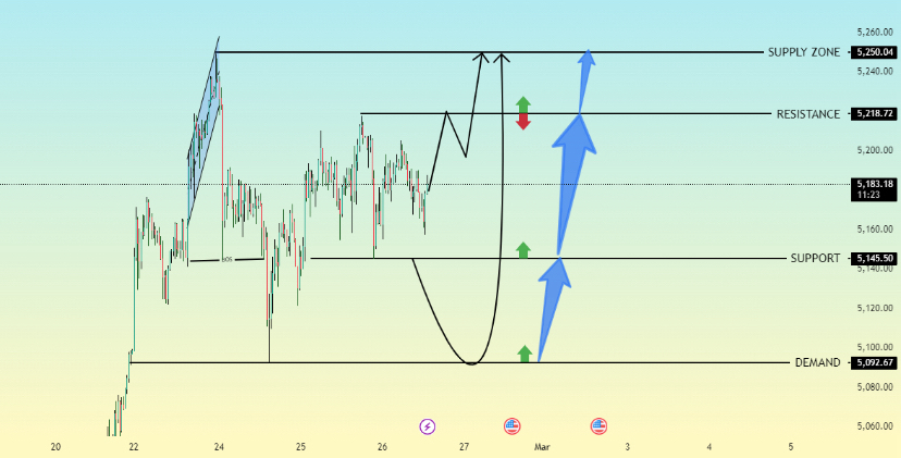 Ouro está atualmente sendo negociado em torno de 5183, mantendo-se acima do suporte de meio intervalo e mantendo uma estrutura bullish de curto prazo.
