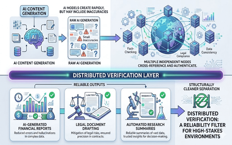 Isso também abre casos de uso práticos. Pense em relatórios financeiros gerados por IA, redação de documentos legais ou resumos de pesquisa automatizados. Nessas áreas, até pequenas imprecisões podem causar problemas reais. Uma camada de verificação distribuída poderia atuar como um filtro de confiabilidade antes que as informações sejam usadas em ambientes de alto risco.