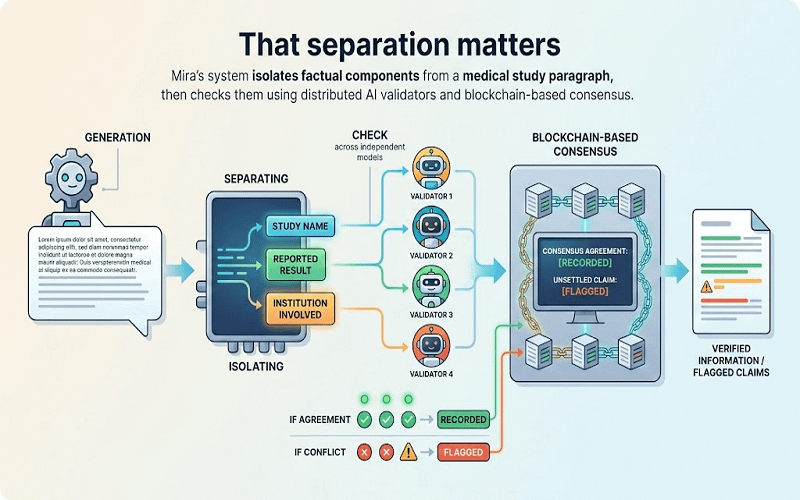 Se um modelo gera um parágrafo sobre um estudo médico, o sistema da Mira isola os componentes factuais. Por exemplo, o nome do estudo, o resultado reportado, a instituição envolvida. Essas partes são então verificadas através de modelos independentes. Se múltiplos modelos concordam, esse acordo é registrado. Se houver conflito, a afirmação é sinalizada.
