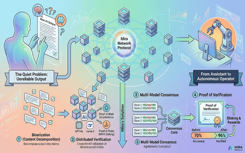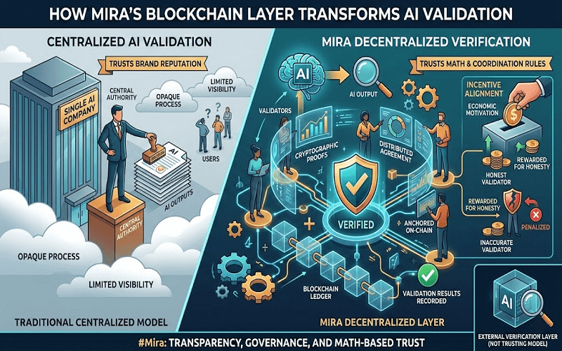 Em vez de depender de uma autoridade central para declarar algo verificado, Mira utiliza provas criptográficas e mecanismos de acordo distribuído para registrar os resultados de validação. Uma vez que uma afirmação foi avaliada e o consenso foi alcançado, esse resultado é ancorado na blockchain. A confiança vem da matemática e das regras de coordenação, não da reputação da marca.