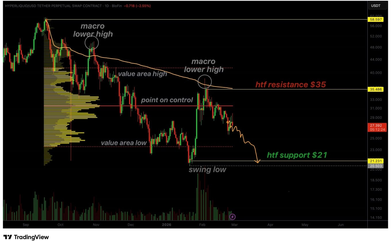 O preço do Hyperliquid permanece sob pressão corretiva após formar outro máximo inferior macro perto da resistência chave. A falha em retomar níveis críticos de volume agora aumenta a probabilidade de um movimento em direção ao suporte de $22.