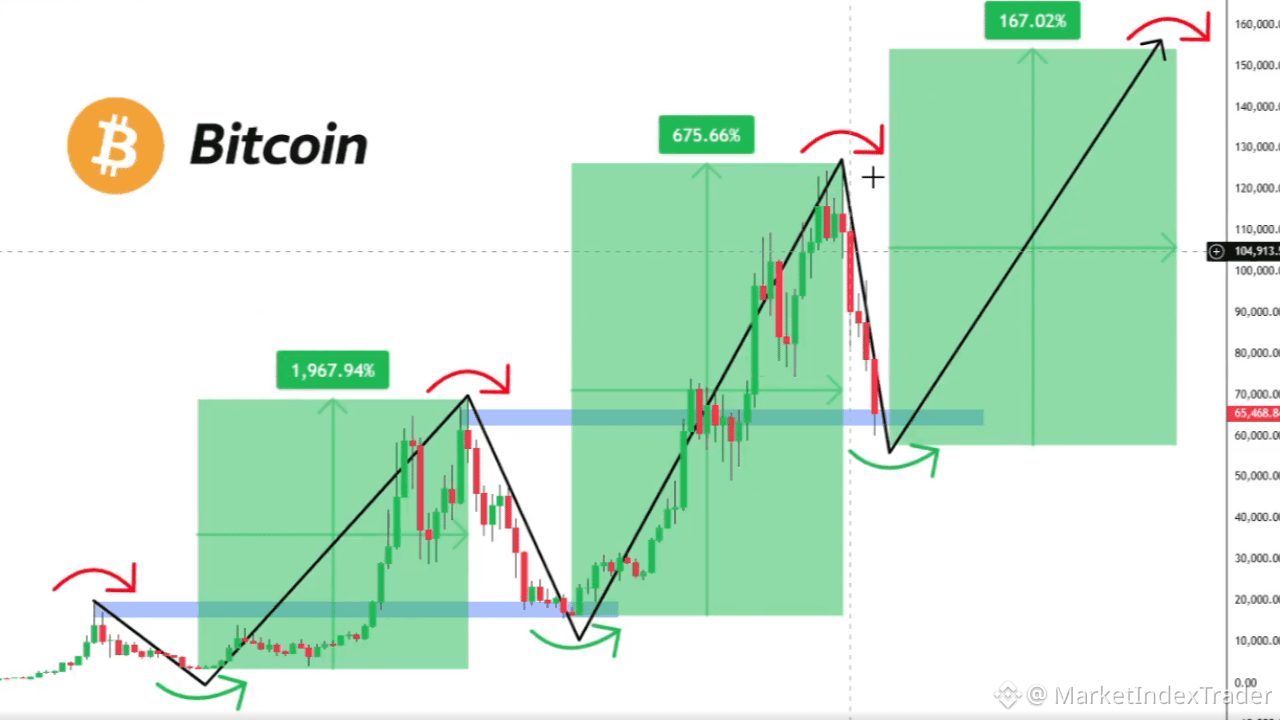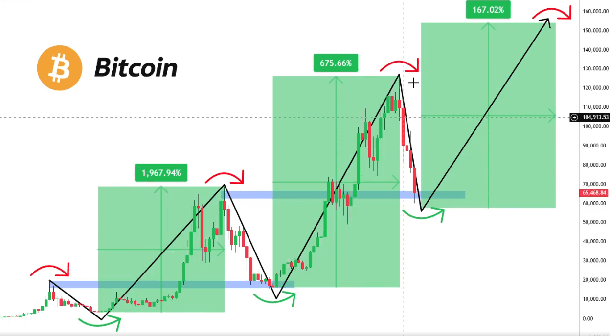 De uma perspectiva técnica, o Bitcoin passou por uma correção significativa a partir de seus altos recentes (acima de $120.000), e o padrão do gráfico sugere um possível reteste de uma zona de suporte crucial em torno de $65.000 - $67.000. Este nível anteriormente atuou como uma forte resistência e agora é antecipado para servir como um suporte robusto, alinhando-se com o padrão observado em ciclos anteriores. O preço atual do BTC está em torno de $104.913,5, indicando que tivemos uma correção, mas uma nova queda em direção a esse suporte chave poderia apresentar uma entrada ideal. Se esse suporte se mantiver, poderíamos ver um forte repique, com o gráfico projetando alvos bem acima de $150.000 para a próxima perna.