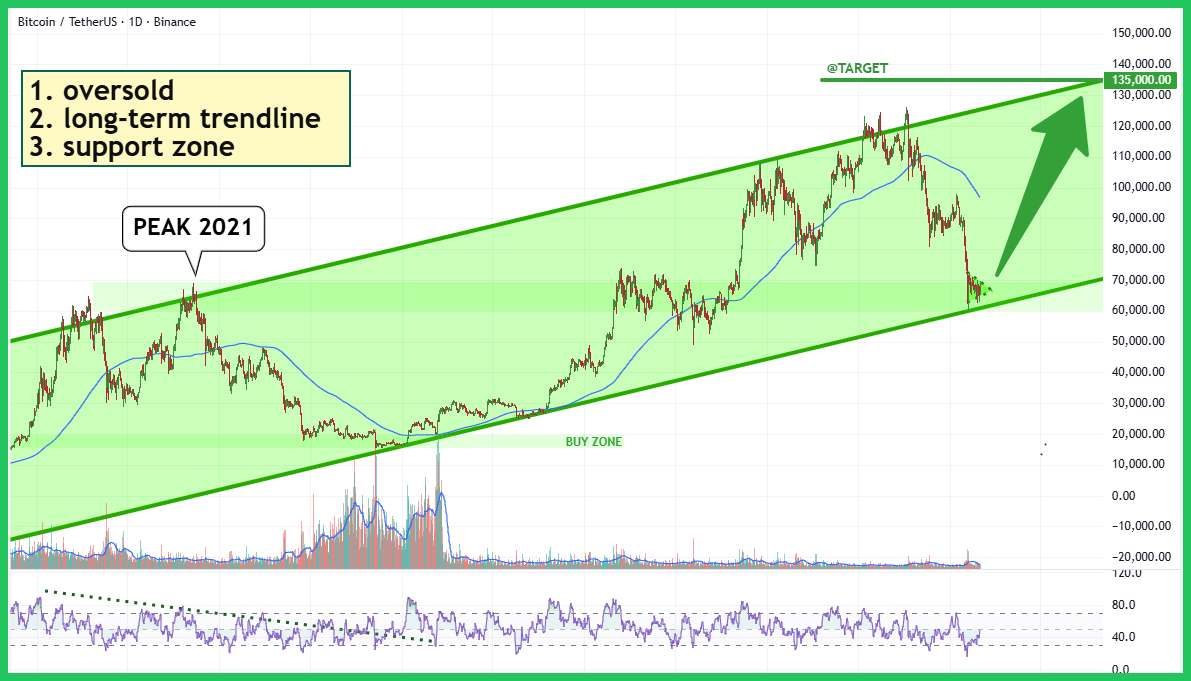 Certo equipe, vamos analisar este suculento gráfico diário de BTC/USDT e ver o que está cozinhando. O Bitcoin está atualmente fazendo uma declaração forte, encontrando um terreno sólido bem na borda inferior de seu canal de tendência ascendente de vários anos. Esta não é apenas uma linha; é uma zona crítica de suporte de longo prazo, situada firmemente entre $60.000 e $65.000. Adicionando aos sinais de alta, o RSI está piscando condições de sobrevenda, historicamente uma área primordial para um salto. Nossos olhos estão na resistência imediata em torno de $70.000 - $72.000, com um potencial alvo de longo prazo de $130.000 - $135.000 se o canal se mantiver.