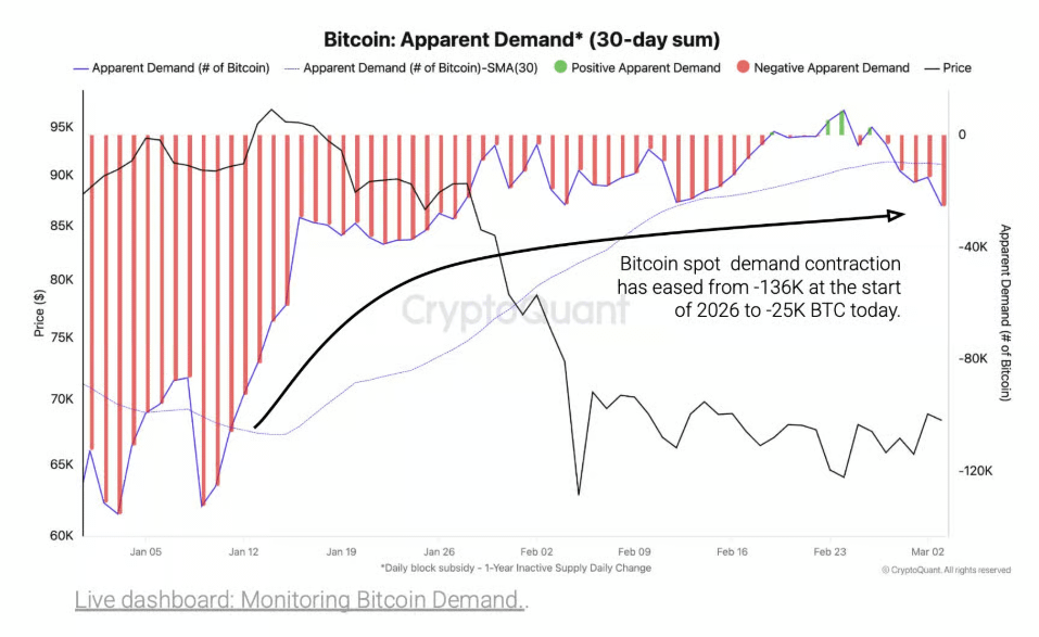 Os dados mostram que a demanda à vista (spot demand) por Bitcoin melhorou significativamente recentemente. O índice que mede a demanda real anteriormente registrou uma contração em torno de -136.000 BTC no início de 2026, mas agora foi reduzido para cerca de -25.000 BTC. Isso indica que a pressão de venda no mercado diminuiu consideravelmente em comparação com o período anterior.