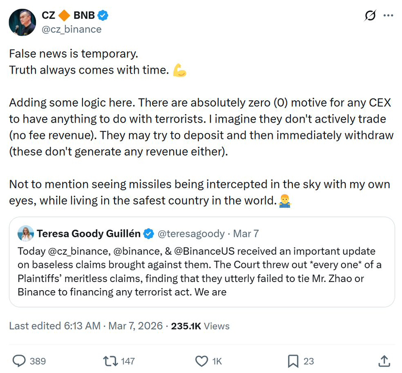 "The court has unambiguously rejected the false and damaging narrative that Binance assisted terrorists."