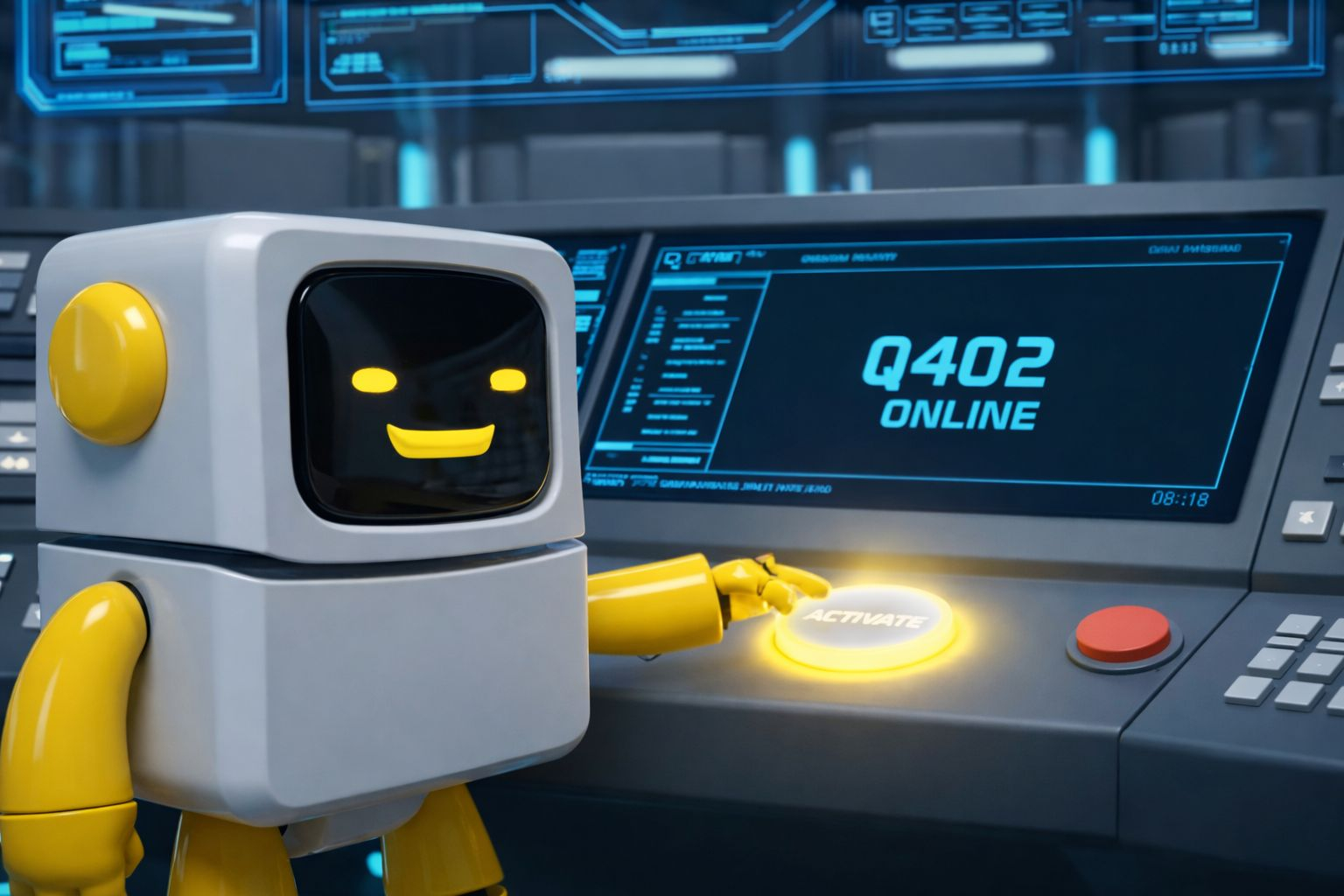 In the image, Agent Q activates a control interface displaying Q402 Online — signaling the start of Q402 Mode, a protocol designed to enhance how AI agents analyze and react to market conditions.