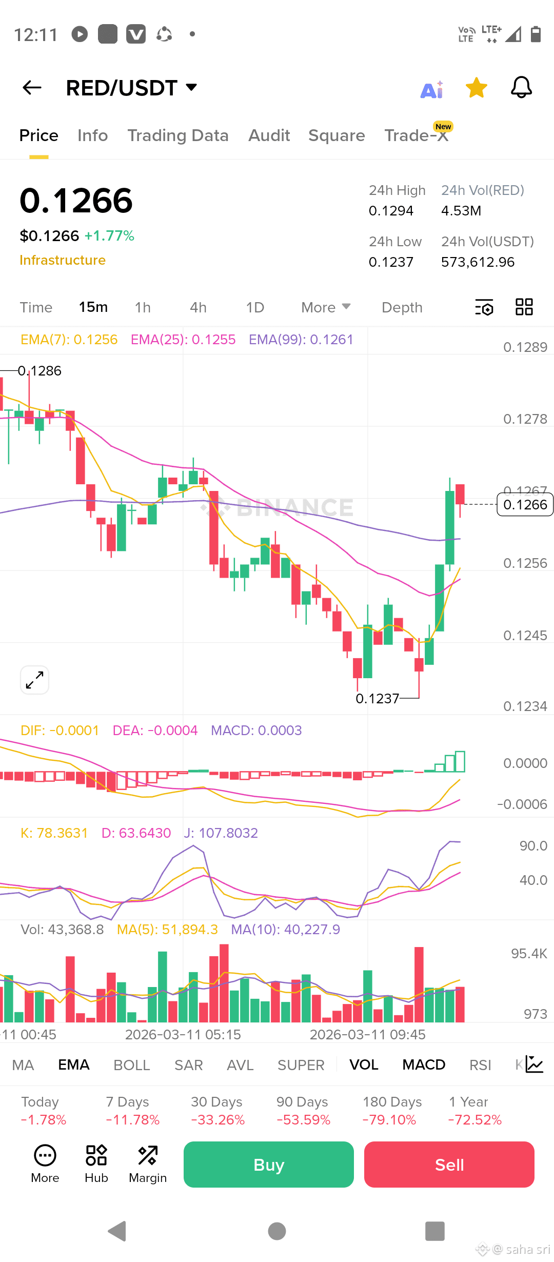 Track volume: 4.5M RED (~$570k USDT) in 24h is okay but not explosive; needs higher to sustain upmoves.