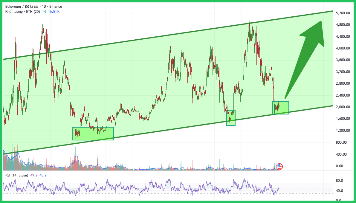Nível de Suporte: O preço tocou recentemente o limite inferior deste canal, aproximadamente na faixa de $1.800 – $2.000. Historicamente, como mostrado pelas caixas destacadas em verde, esta linha de tendência serviu como uma poderosa zona de acumulação, levando a grandes ralis.