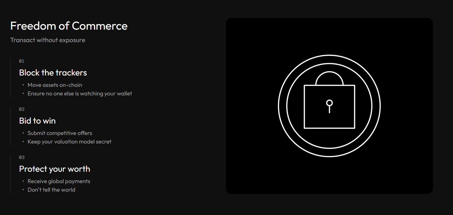 Submit a sealed bid in an auction so competitors can't game your offer. Receive international payments without broadcasting your net worth. Midnight calls it "transact without exposure.