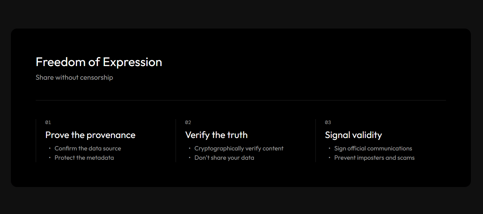 Prove that content is authentic and came from a real source, without revealing who you are. Sign official communications to prevent impersonation. Share information credibly without making yourself a target.