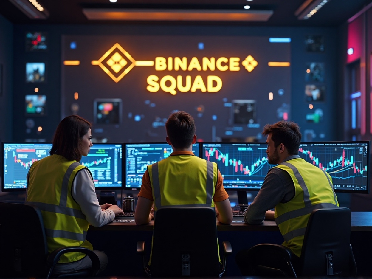 “A professional crypto trading team wearing safety vests 🦺, sitting together in a modern office with multiple computer screens showing cryptocurrency charts (like Binance interface). The environment looks high-tech, with neon lighting, digital graphs, and a futuristic atmosphere. On the wall, the text ‘Binance Squad’ is visible in bold modern font. Realistic style, ultra-detailed, 4K resolution, cinematic lighting, highly professional, sharp focus.” $BNB #Binance #TrumpSaysIranWarWillEndVerySoon