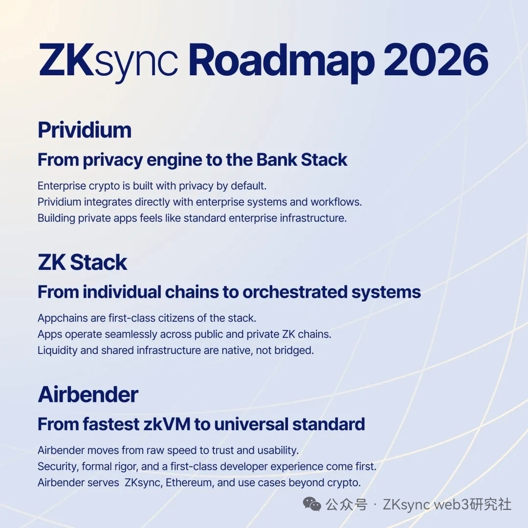 O roteiro do ZKsync para 2026 se concentra em três direções centrais, cada uma mirando um campo de batalha crucial.