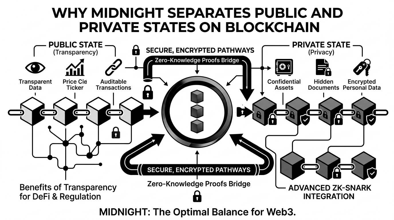 Midnight's architecture recognizes this reality. Public state handles what genuinely requires universal verification: proof of consensus adherence, prevention of double-spending, maintenance of cryptographic invariants. Private state handles everything else: transaction details, asset ownership, business relationships, financial positions. This separation allows each category to optimize for its actual use case rather than forcing everything into a single model.