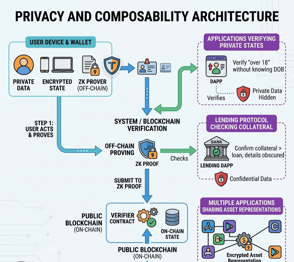 This architecture enables a new kind of composability. Applications can verify private state through zero-knowledge proofs without accessing it directly. A lending protocol can confirm sufficient collateral without seeing composition. Multiple applications can share underlying asset representations where each knows only what they're cryptographically entitled to know.