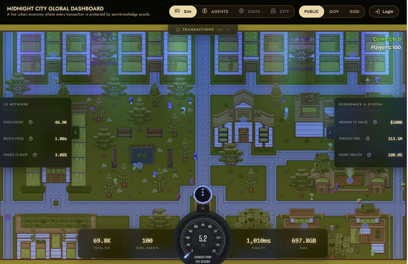 A atualização também introduziu a Midnight City, que é uma simulação em grande escala projetada para demonstrar como a rede lida com a atividade quando muitos usuários e aplicações interagem simultaneamente. Como o Midnight foca em privacidade programável alimentada por criptografia de conhecimento zero, a simulação fornece uma maneira visível de entender como a divulgação seletiva e as transações confidenciais operam em escala dentro da rede.