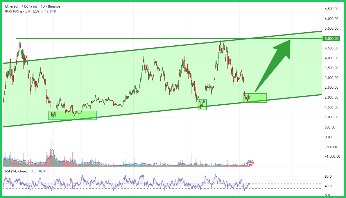 Com base no gráfico diário do Ethereum, o ETH está atualmente apresentando uma configuração macroeconômica convincente. A ação do preço tem aderido estritamente a um canal paralelo ascendente de vários anos, e os movimentos recentes sugerem um salto crítico de uma zona de suporte histórica.