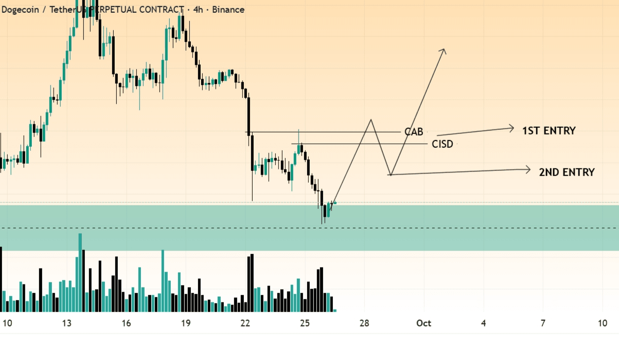 $DOGE está caindo desde 14 de setembro e este é o melhor momento para comprar, pois aqui é um ótimo bloco de ordens de alta probabilidade e zona de gap de valor justo. Se você olhar os volumes do TF H4, entenderá por que estou dizendo para comprar; se você não souber, eu explico. Na zona de OB+FVG, houve um clímax de vendas no TF H4 que indica baleias, instituições, banqueiros ou qualquer grande trader comprando e esperamos converter esse volume em setup CAB ou CISD, então negociamos.