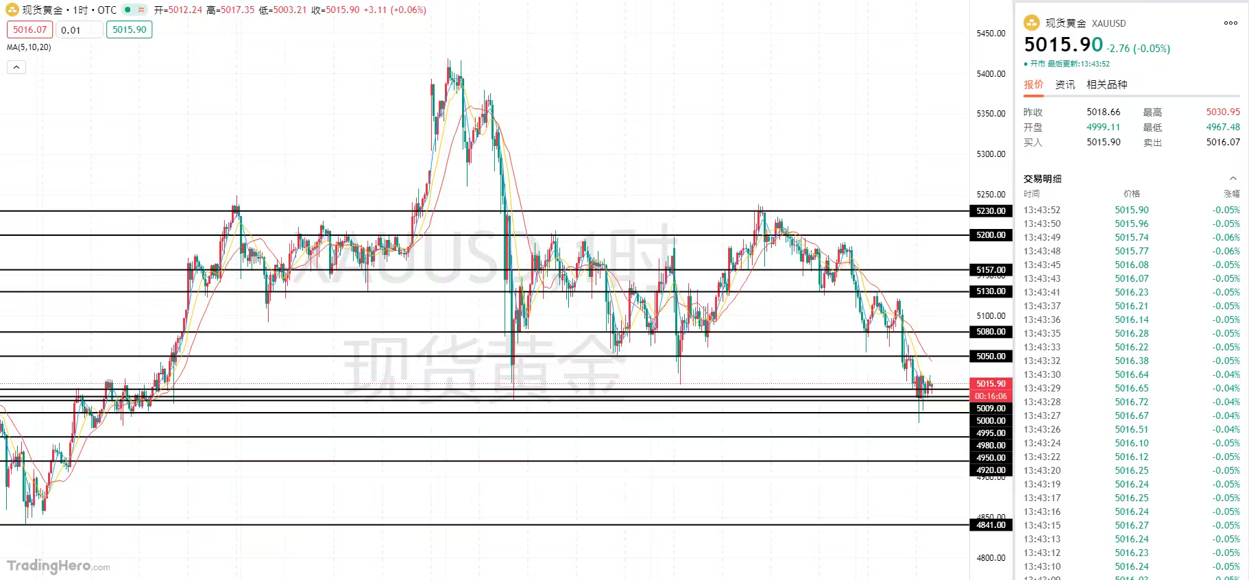 上周五黄金继续走弱,日线收了根中阴线,最低跌到5009后又拉了点回来,收盘刚好卡在震荡上行通道的下沿支撑位,短期空头的力气放了一些,但还没完全泄完。上周四那根大阴线压着,5日和10日均线已经往下拐了,黄金一直在5200下面弱得很,不过均线还没彻底死叉,所以还是区间震荡的样子。从大趋势看,这次下跌只是涨多了之后的技术性回调,就算短期撑不住再跌几根阴线,也改不了中期看涨的大方向,顶多就是震荡的时间变长。现在低点一个比一个高(4402-4654-4841-4996-5009),5000这个关口是多空关键,上周五没跌破,说明有人在下面接盘。小时图上看,黄金还在震荡上行的通道里,下沿支撑买盘很活跃;5103是短期强弱的分界线,要是能突破并站稳(收大阳线或者连续阳线),先看5157的压力,破了之后就能往5200冲。周初黄金大概率先跌后涨,在区间里晃,跌完之后企稳反弹的可能性更大。