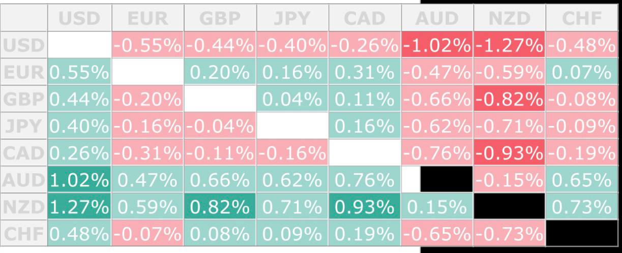 The heat map shows percentage changes of major currencies against each other. The base currency is picked from the left column, while the quote currency is picked from the top row. For example, if you pick the US Dollar from the left column and move along the horizontal line to the Japanese Yen, the percentage change displayed in the box will represent USD (base)/JPY (quote).$FDUSD