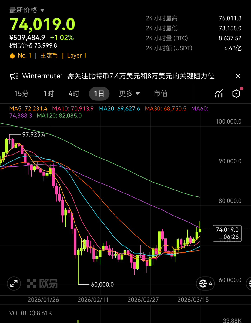 目前市场买盘比较强,很多资金在低位接盘,所以很难出现大幅下跌。就算因为消息面出现短暂回调,也很难跌破70000美元,下方支撑比较稳固。不过,在75000美元上方有不少压力,短期很难一口气冲得很高,经常会出现冲高后小幅回落的情况。