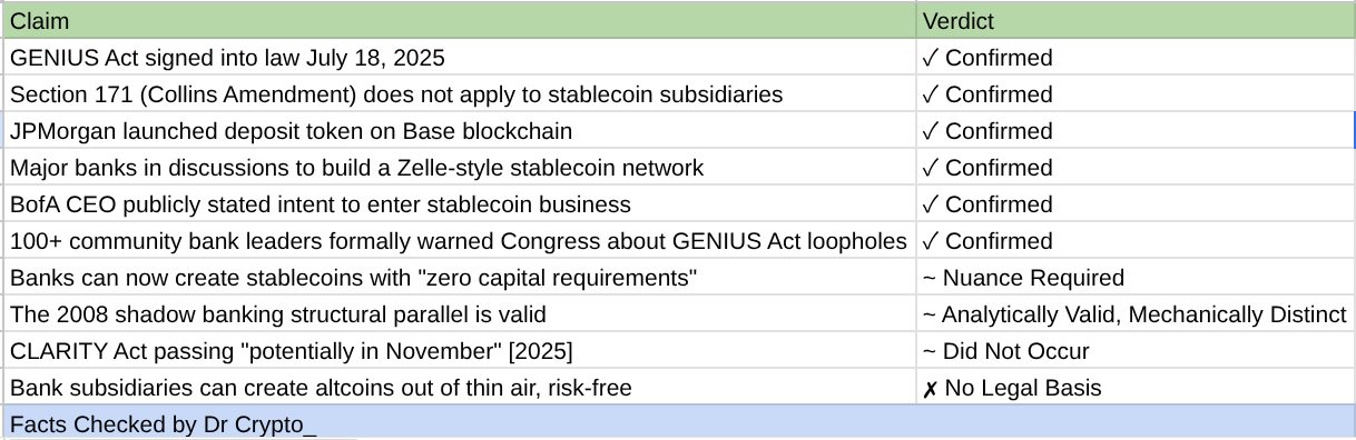 A narrativa central está substanciada: o Ato GENIUS cria uma nova estrutura de subsidiária para stablecoins emitidas por bancos, explicitamente carve essa estrutura das exigências de capital da Emenda Collins, e os maiores bancos da América estão se movendo rapidamente e publicamente para esse espaço. O JPMorgan está ativo na Base. O CEO do Bank of America declarou suas intenções na televisão nacional. Uma coalizão formal bipartidária de bancos comunitários levantou alarmes regulatórios por escrito.