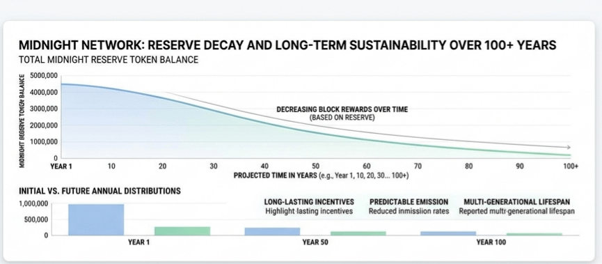 As the reserve gets smaller the amount of tokens distributed also shrinks. This creates a very long lasting curve that allows the Midnight network to remain active for hundreds of years.