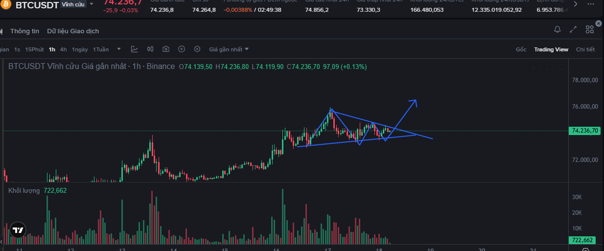 Nếu BTC phá vỡ cạnh trên của tam giác, giá có thể nhanh chóng hướng về vùng 75.5K – 77K. Khi đó, lực short có thể bị squeeze và đẩy giá đi nhanh hơn.