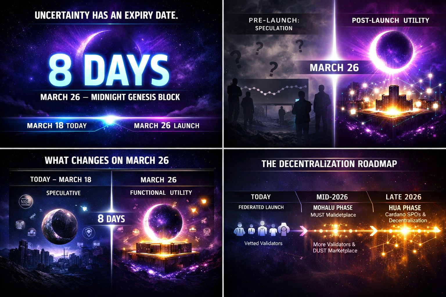 O token NIGHT foi introduzido mais cedo, permitindo que o ecossistema começasse a distribuir o ativo e preparar a liquidez enquanto a própria blockchain de privacidade continuava o desenvolvimento.